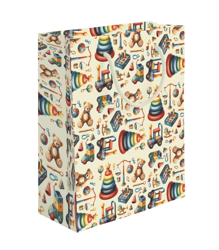 Gavepose medium i matt utførelse med leketøy-motiv og kraftig bomullshåndtak. Produsert i Italia på FSC godkjent papir, FSC A000506.