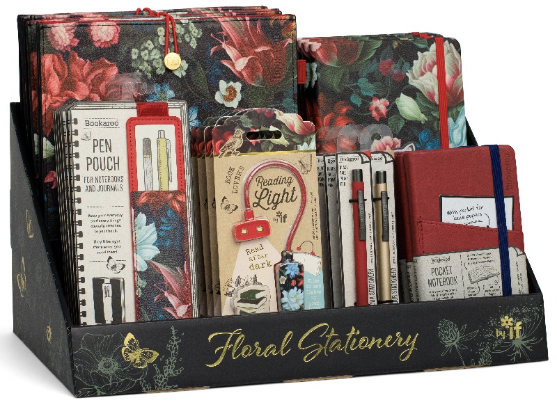 "Bookaroo - Dark Floral" display med produkter i sort farge med gullfolierte detaljer.