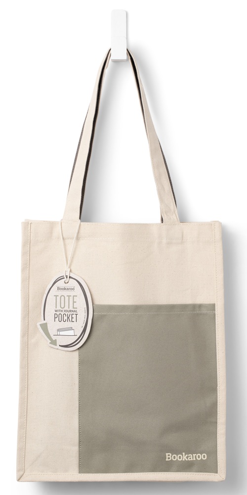 Bookaroo Tote Bag i farger Fern og Cream, produsert i kraftig 100 % bomull og dobbel tykkelse på bærehåndtakene. Med utvendig lomme for notatboken din m.m.