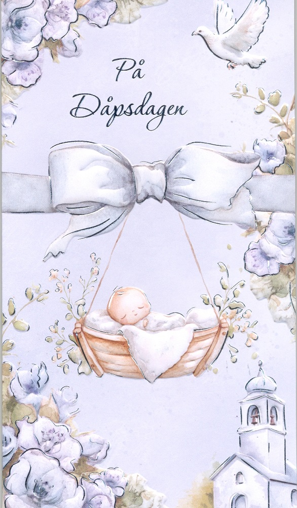 "På Dåpsdagen". Dobbelt preget kort med sølvfolierte detaljer. Trykket på FSC godkjent papir (FSC C136305).