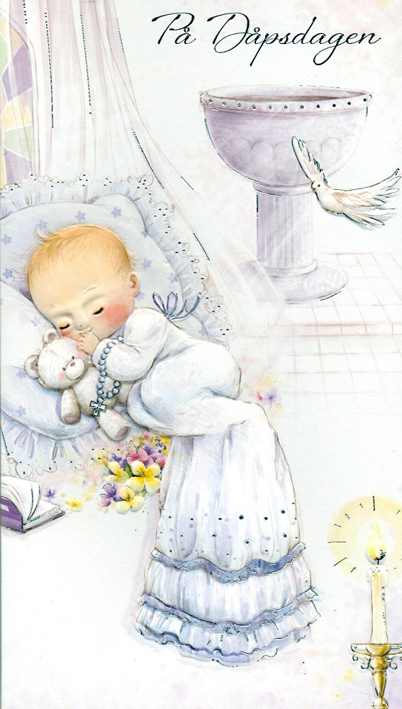 "På Dåpsdagen". Dobbelt preget kort med sølvfolierte detaljer. Trykket på FSC godkjent papir (FSC C136305).