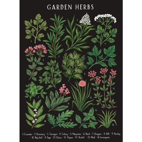 Dobbelt rektangulært kunstkort fra Museums & Galleries, England. Motivet er "Garden Herbs" designet av Kaja Kajfez. Kortet er produsert i United Kingdom på FSC MIX Paper C129053 og kan resirkuleres.