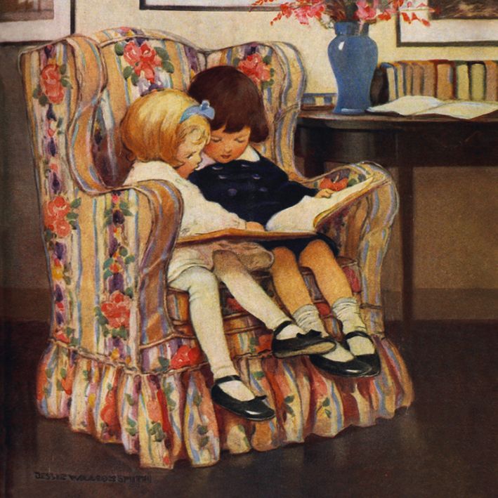 Dobbelt kvadratisk kunstkort fra Museums & Galleries, England. Motivet er "Sitting Pretty" av Jessie Willcox Smith (American) 1863-1935. Motivet er fra omslaget til "Good Housekeeping Magazine" November 1922. Kortet er produsert i United Kingdom på FSC MIX Board C014059 og kan resirkuleres.