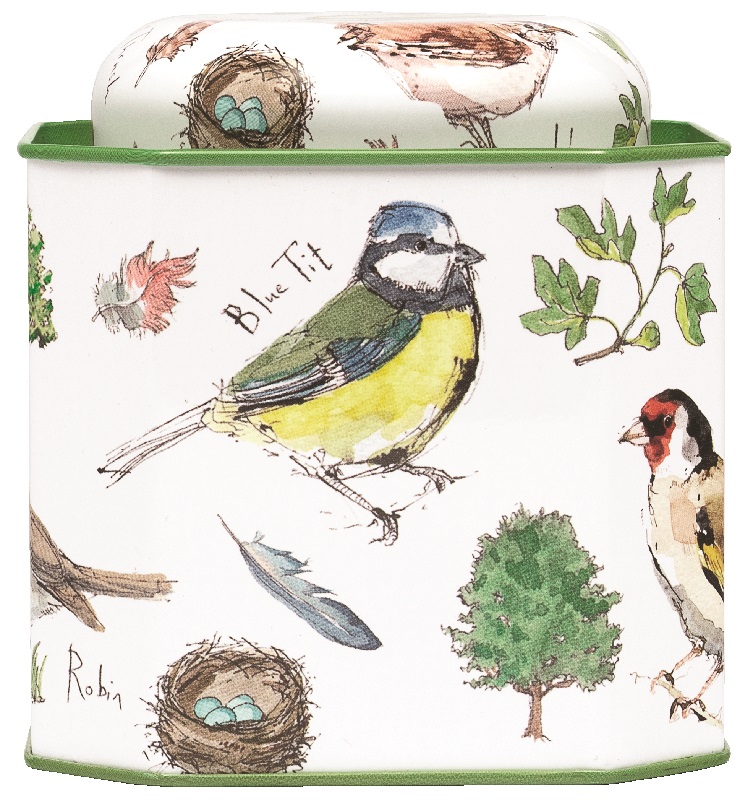 Kvadratisk metallboks fra Elite Tins, England i "Bird Song" design fra Madeleine Floyd. Tegningene illustrerer småfugler som Dompap, Blåmeis, Svarttrost, Gråspurv, Rødstrupe m.fl.