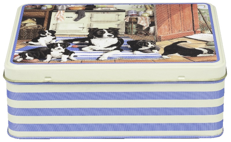 Rektangulær metallboks i "Working Mum" design fra Tracy Hall. Motivet viser en Border Collie tispe med valper.