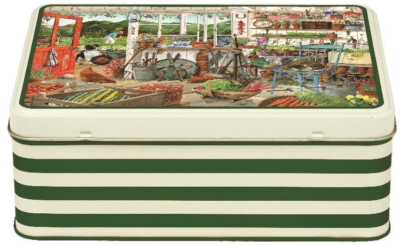 Rektangulær metallboks i "Garden Shed" design fra Tracy Hall. Motivet viser innsiden av et hagedrivhus.