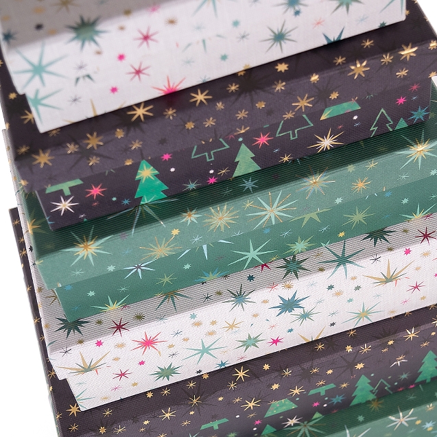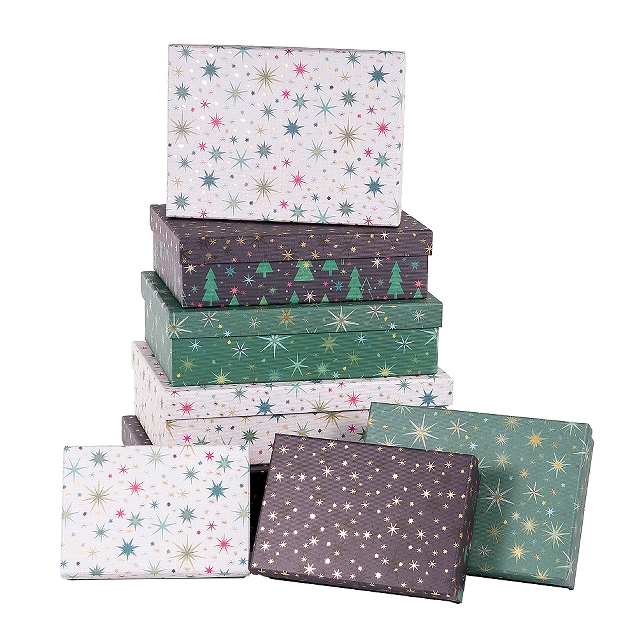 Rektangulært gaveeske-sett med 8 esker i assorterte farger med gull-folierte julesymboler i kraft-kartong fra Artebene i Tyskland.