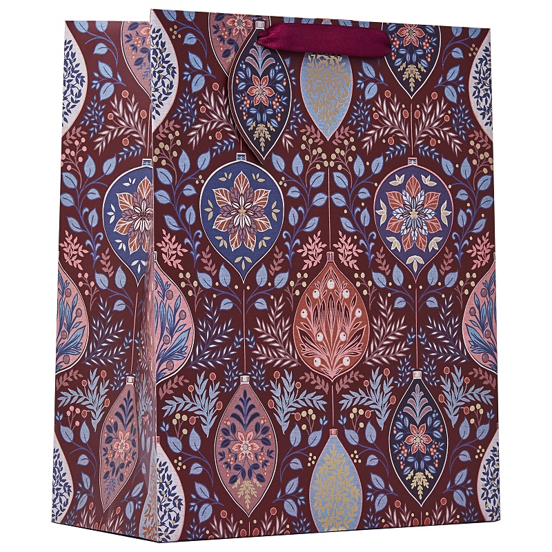 Gavepose large med motiv av julekuler, designet av Violet. Posen har gullfolierte detaljer, kraftig bæresnor og pakkelapp.