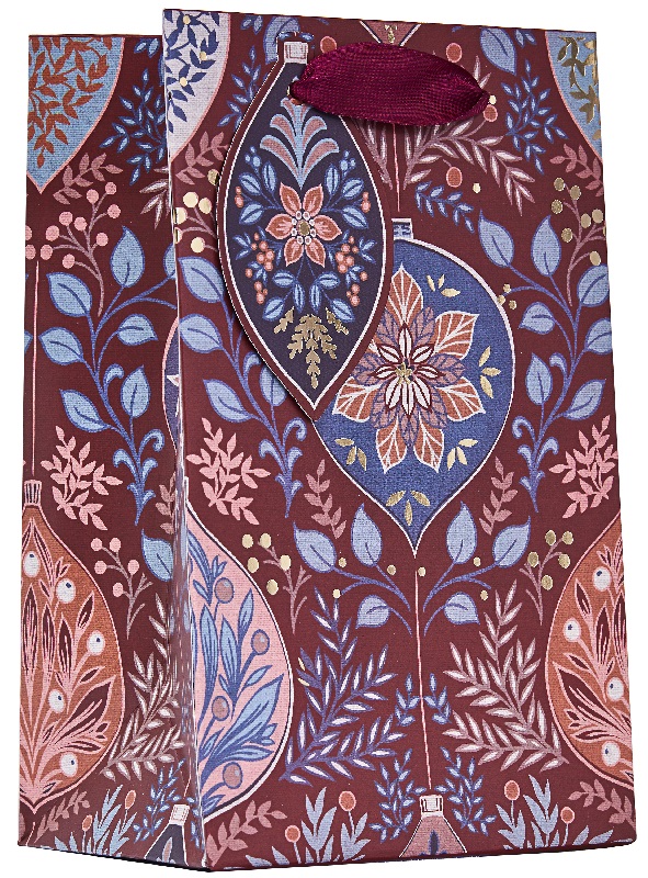 Gavepose parfyme med motiv av julekuler, designet av Violet. Posen har gullfolierte detaljer, kraftig bæresnor og pakkelapp.