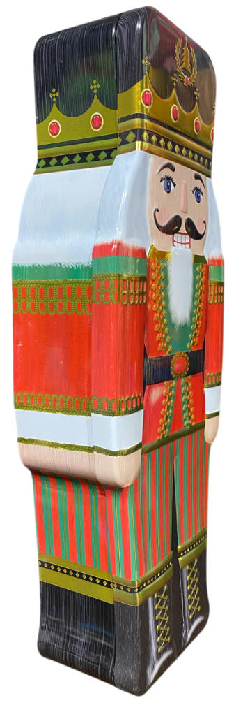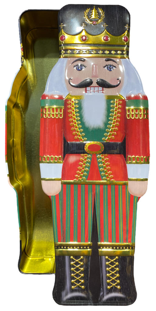 Metallboks med preget lokk, boksen er utformet som nøtteknekeren og er fin til oppbevaring av småkaker,