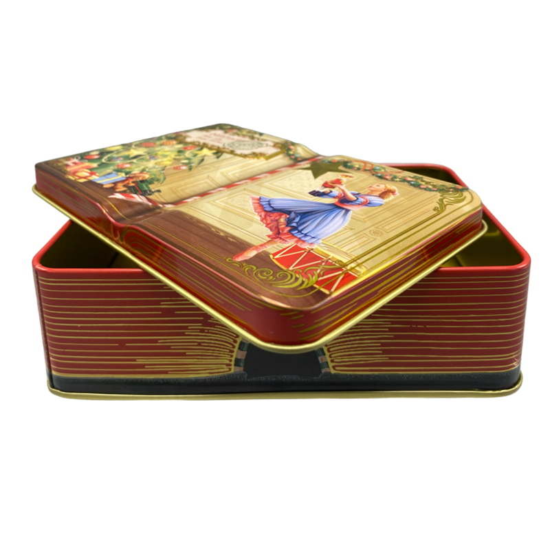 Nostalgisk metall-boks med preget lokk, boksen er utformet som en bok.