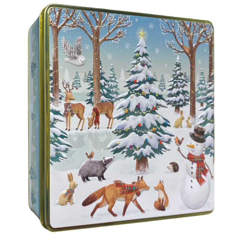 Kvadratisk metallboks med vintermotiv og preget lokk. Boksen er fin til oppbevaring av småkaker,kjeks og sjokolade m.m.