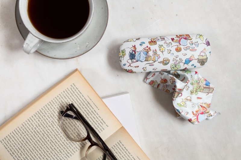 Brille-etui i "hard-shell case" med motiv "Spring Picnic" fra første bok i serien om Brambly Hedge. Brille-etuiet er trukket innvendig med fløyel og det medfølger pusse-klut i samme design.