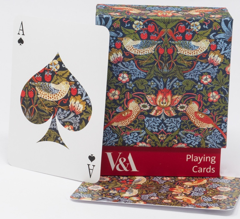 Tradisjonell kort-stokk med 52 kort pluss 2 jokere. Ryggen på kortene har samme design (Strawberry Thief) som esken. Kortene og esken er produsert av FSC MIC Paper C007972.