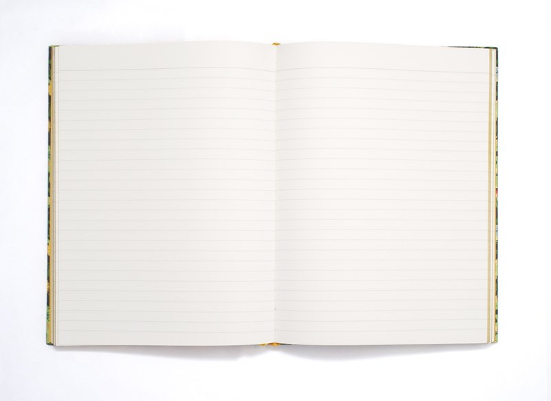 Stor innbundet skrivebok med linjer fra Museums & Galleries med design "Leicester Wallpaper" av J.H. Dearle (1859-1932), England, 1912. Med gullsnitt, gullfolierte detaljer på omslaget, innvendig lomme og strikk-lukking. Boken er trykket på FSC Mix Paper C 007972.