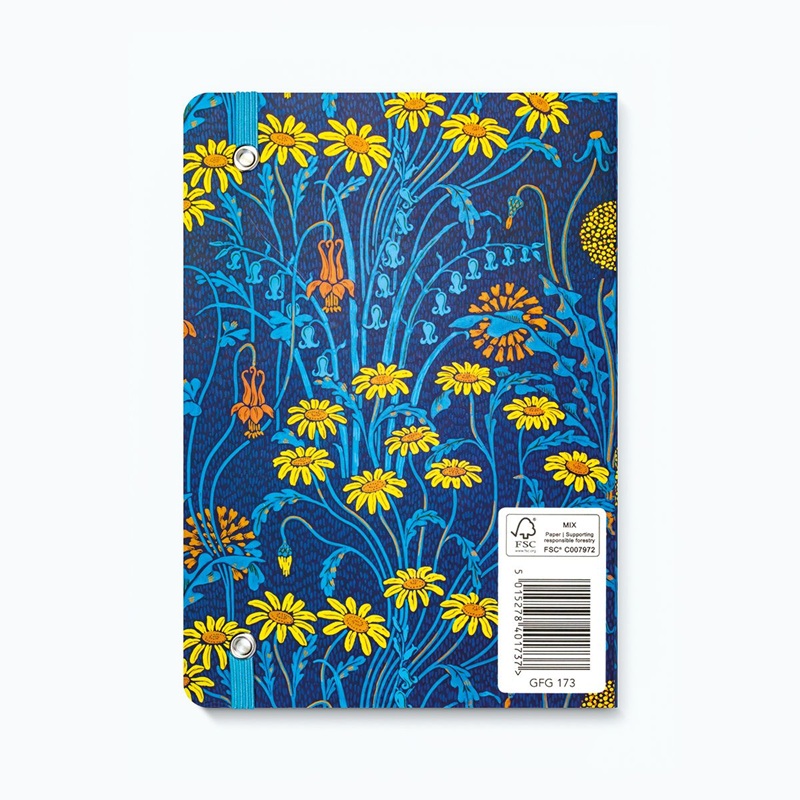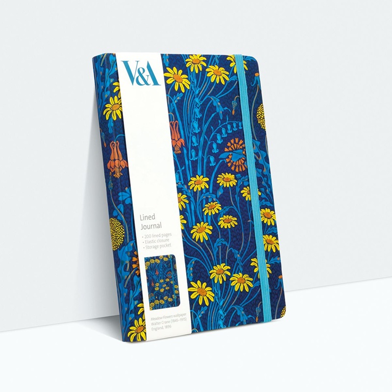 Linjert skrivebok med strikklukking og lomme for oppbevaring på innsiden av permen. Produsert på FSC Mix Paper C007972 av Museums & Galleries, England. Designet "Meadow Flowers" er hentet fra en tapet designet i 1896 av Walter Crane (1845-1915).