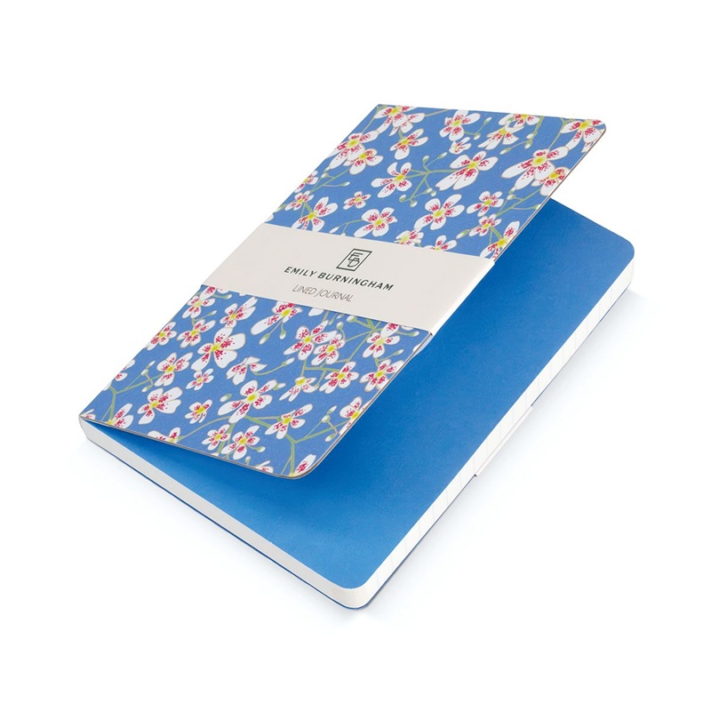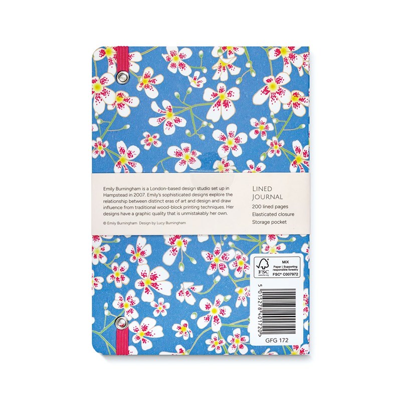 Linjert skrivebok med strikklukking og lomme for oppbevaring på innsiden av permen. Produsert på FSC Mix Paper C007972 av Museums & Galleries, England. Motivet "Saxifrage" er designet av Emily Burningham, et London basert design studio.