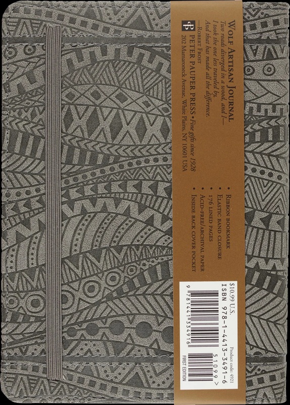 Innbundet Artisan Journal (skrivebok) med linjerte sider, preget innbinding, strikk-lukking og innvendig lomme. Tekst på forsiden "The free spirit follows the path of the lone wolf"