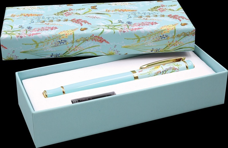 Eksklusiv fyllepenn i solid messing konstruksjon med nydelig lakk finish, gullforgylt pennesplitt for jevn skrift (0,5 line), sort blekk (normalpatron) og blekkpumpe for bruk av blekkhus. Fyllepennen ligger i en gaveeske med gullfolierte detaljer.