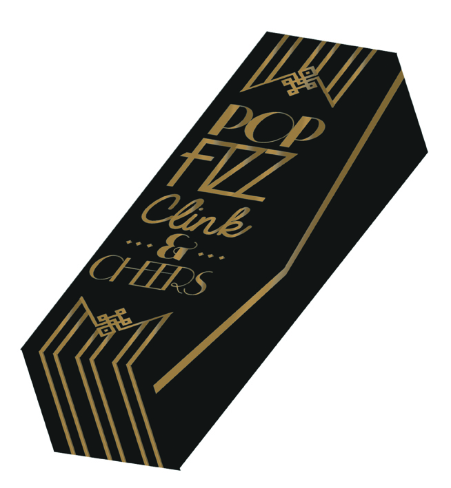 Firkantet flaskeboks med gullfolierte detaljer og magnet-lukking.