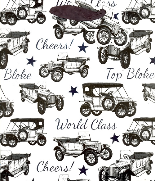 Kraftig gavepose large med motiv av veteranbiler, sølv-folierte detaljer, utstanset bil-pakkelapp og solid snor.
