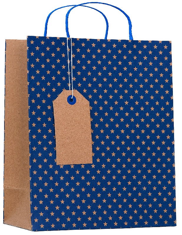Gavepose medium i kraftig matt blå kartong med stjernemotiv designet av Violet. Posen kommer med "twisted" bærehåndtak og pakkelapp, og den er 100% resirkulerbar.