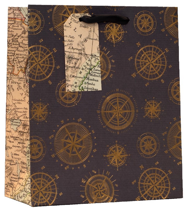 Gavepose i medium størrelse i matt utførelse med gullfolierte detaljer av kompass, designet av Violet. Posen kommer med silkebånd og pakkelapp. Posen er også dekorert på innsiden og deler av den kan resirkuleres.