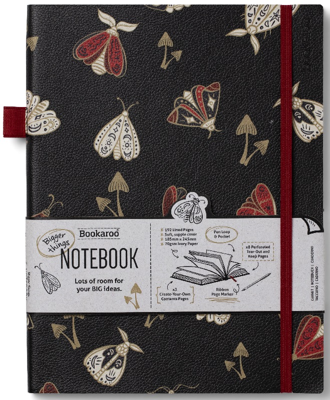 "Bookaroo - Moths - Bigger Things Notebook", skrivebok med 192 linjerte sider, selges enkeltvis.
