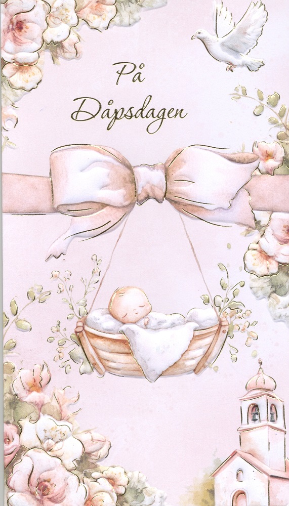 "På Dåpsdagen". Dobbelt preget kort med gullfolierte detaljer. Trykket på FSC godkjent papir (FSC C136305).