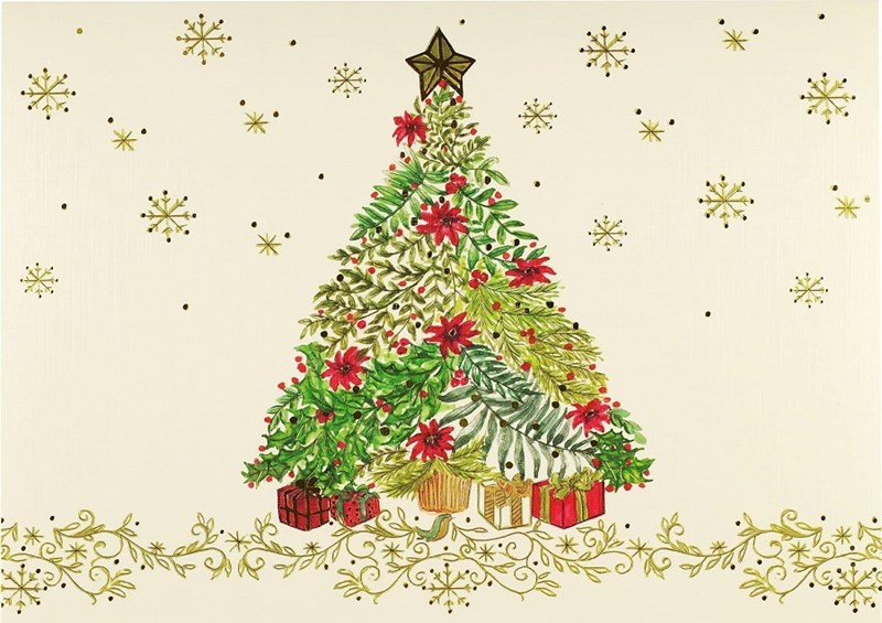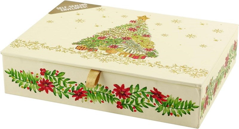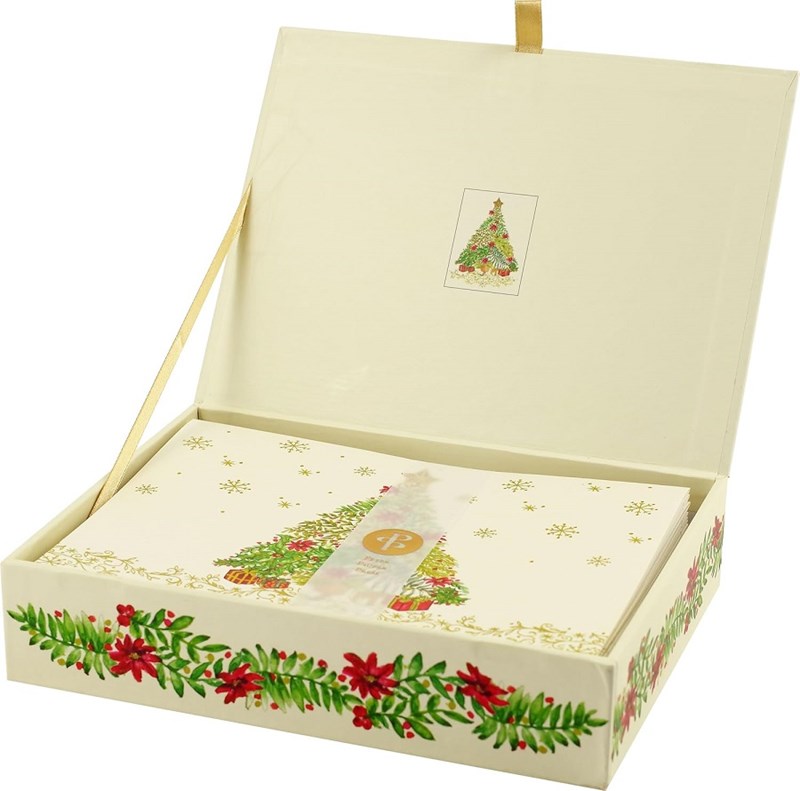 Julekort i eske fra Peter Pauper Press, 20 kort med folierte detaljer og 21 hvite konvolutter.