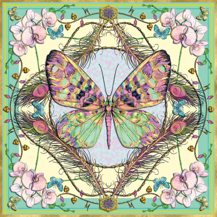 Stort kvadratisk dobbelt kort med preging og folierte detaljer. Kortet er designet av Matthew Williamson som er en verdenskjent designer kjent for sin veldig gjenkjennelig etiske signatur. Han er en mester i trykk, forskjønnelse og bruk av kaleidoskopiske farger. Hans kolleksjoner viser en bohemisk ånd og en tilbakelent sans for glamour. Kortet er trykket i England på FSC sertifisert kartong, og levert av Museums & Galleries Ltd.
