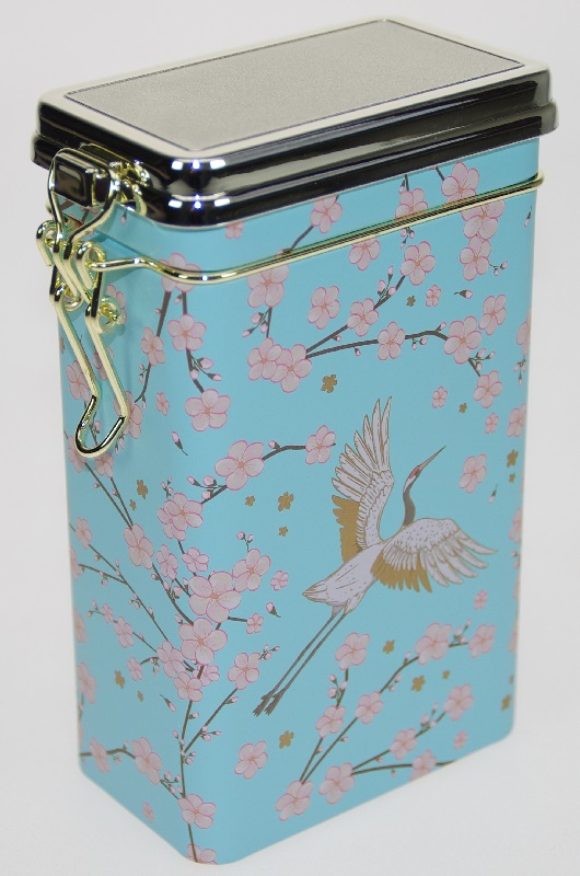 Rektangulær kaffeboks med trane-motiv. Kommer med lukkeklips og pakning i lokket for tett boks.