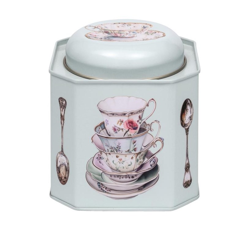 "One Suger Please" 8 kantet Te-boks i metall fra Elite Tins, med tekopp design.