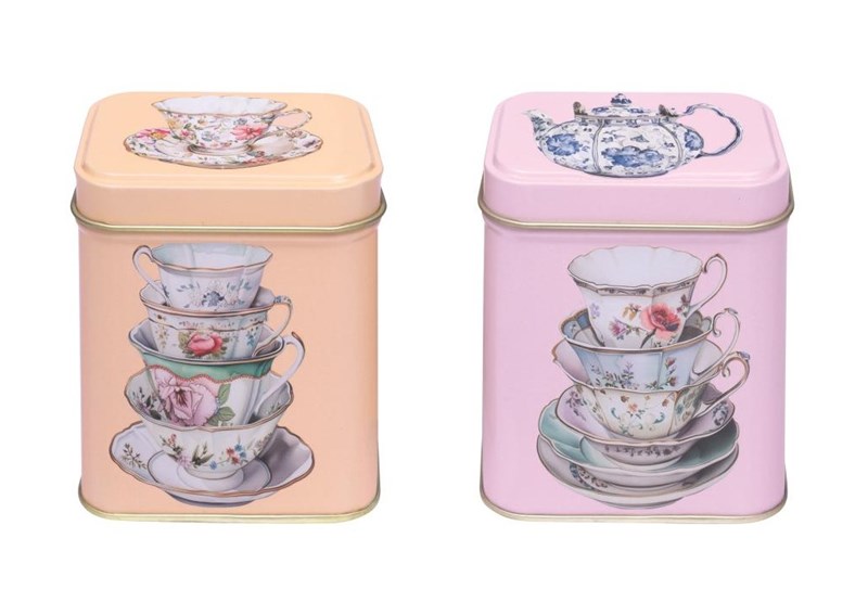 "One Sugar Please" Te-boks 100 gram. 2 assorterte kvadratiske metallbokser fra Elite Tins, England med tekopp design.