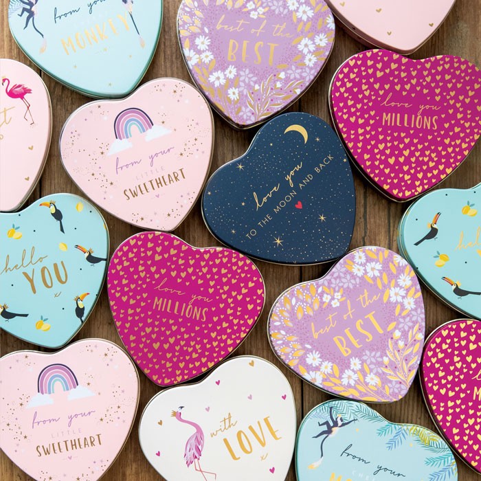 Display med 24 assorterte hjerte metallbokser i design av Sara Miller, London.