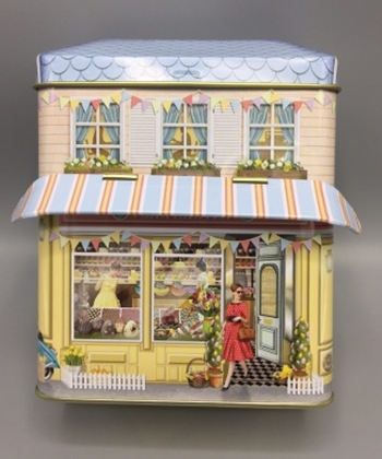 "Sjokoladehus" i metall med fargerike detaljer og baldakin.
