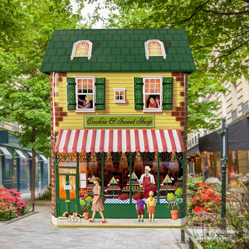 Koselig metallhus med avtagbart tak for oppbevaring av kaffe, kaker og annet.