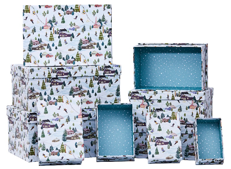 Stort rektangulært gaveeske-sett med 10 esker i kraftig kartong i assorterte størrelser med design av Violet med vintermotiv og dekorerte innsider.