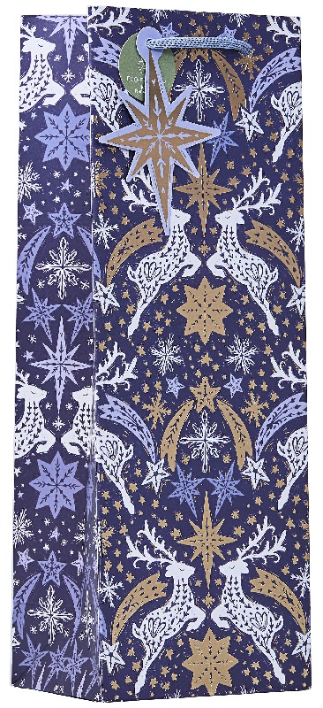 Vinpose med stjernemotiv designet av Violet, gullfolierte detaljer, kraftig bæresnor og pakkelapp. Posen er 100 % resirkulerbar.