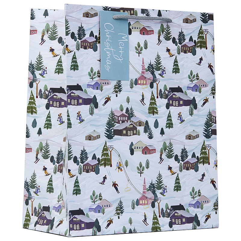 Gavepose large med vintermotiv designet av Violet, kraftig bæresnor og pakkelapp. Posen er 100 % resirkulerbar.