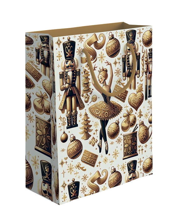 Gavepose medium i matt utførelse med nøtteknekker-motiv, gullfolierte detaljer og kraftig bomullshåndtak.
