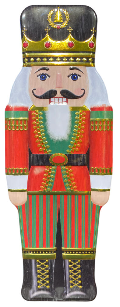 Metallboks med preget lokk, boksen er utformet som nøtteknekeren og er fin til oppbevaring av småkaker,
