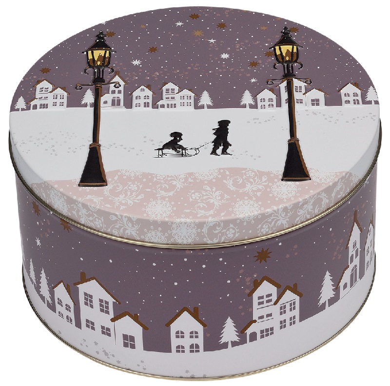 Rund kakeboks med preget lokk og julemotiv.
