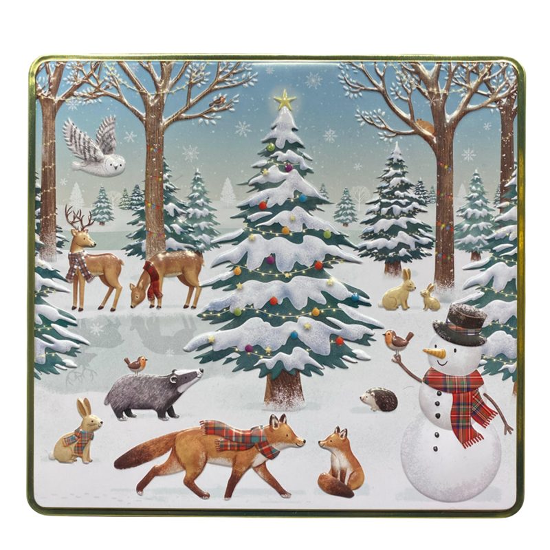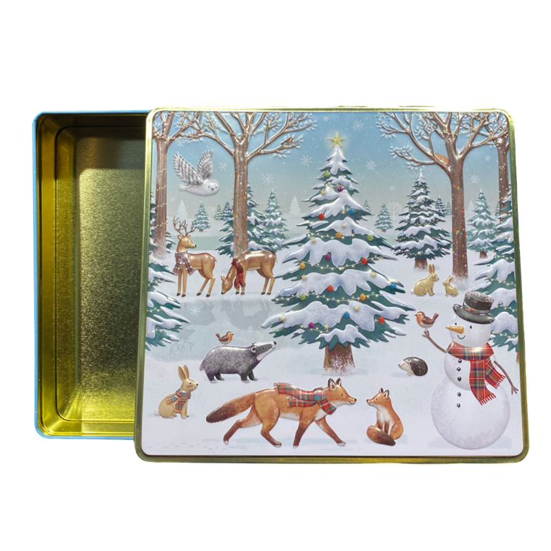 Kvadratisk metallboks med vintermotiv og preget lokk. Boksen er fin til oppbevaring av småkaker,kjeks og sjokolade m.m.