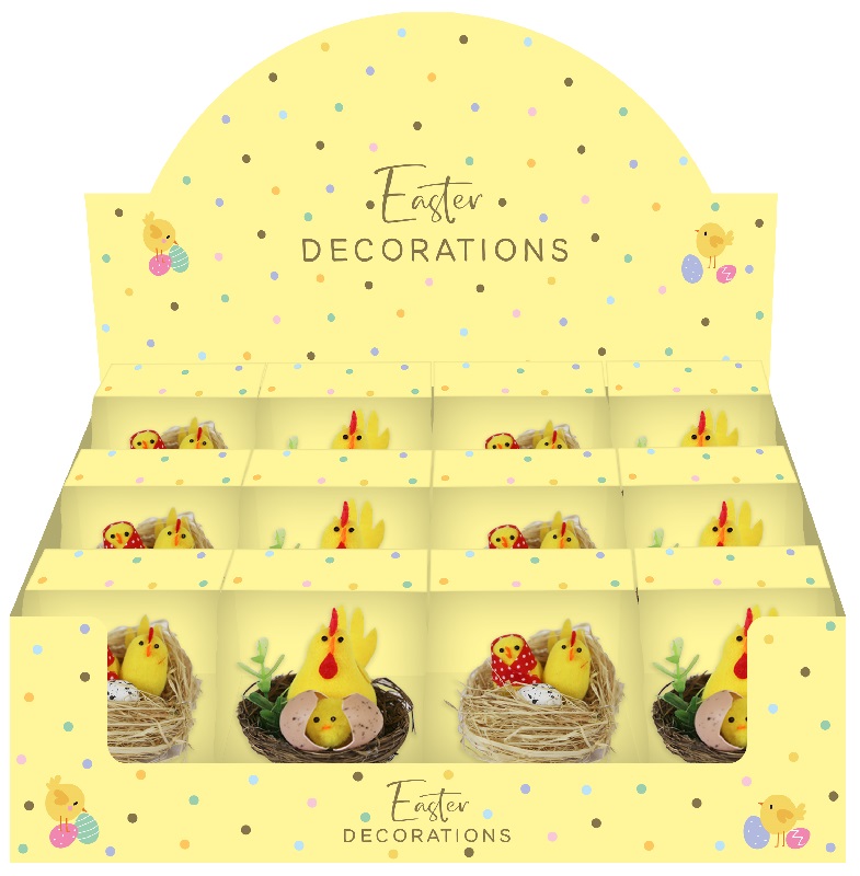 Påskedekorasjon med kylling og egg, selges i display a 30 stk.