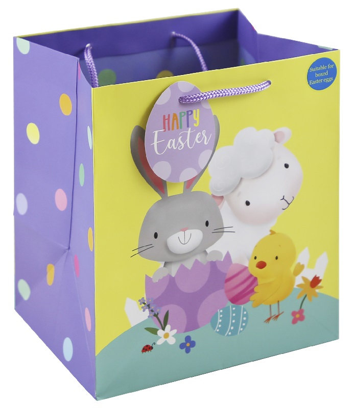 Gavepose medium med ekstra dybde for å kunne romme påskeegg, med dekorert innside, kraftig snor og pakkelapp. Posen er produsert av MIX Paper/Supporting responsible forestry FSC C105249.