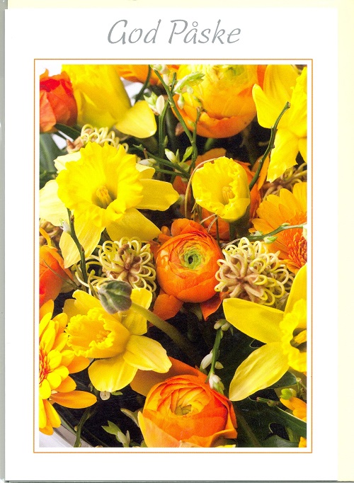 Dobbelt kort med vårblomster. Tekst "God Påske"