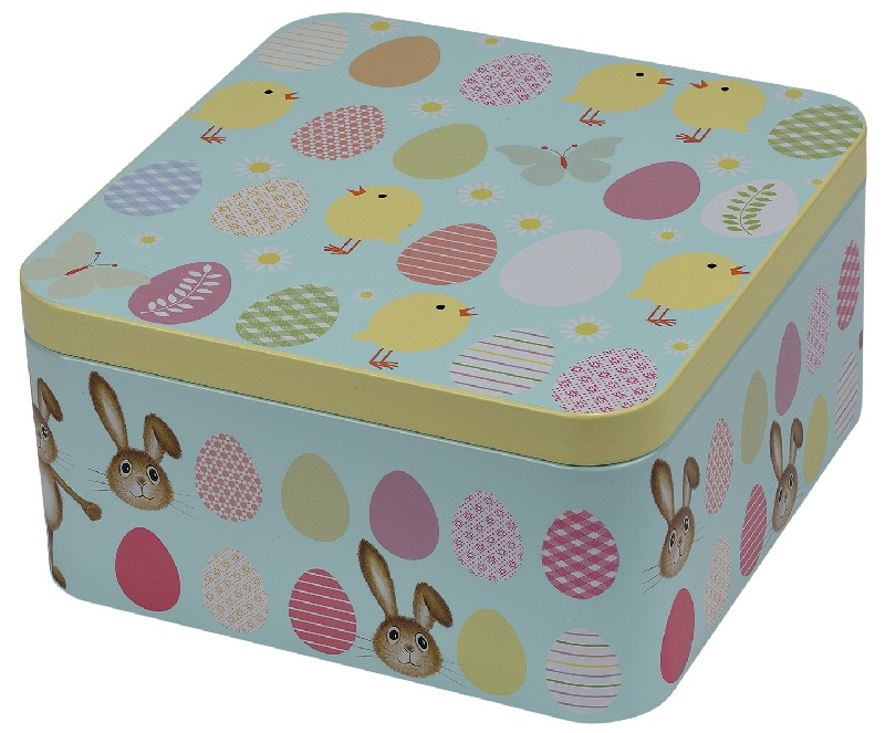 Kvadratisk metalleske med påskemotiv.
