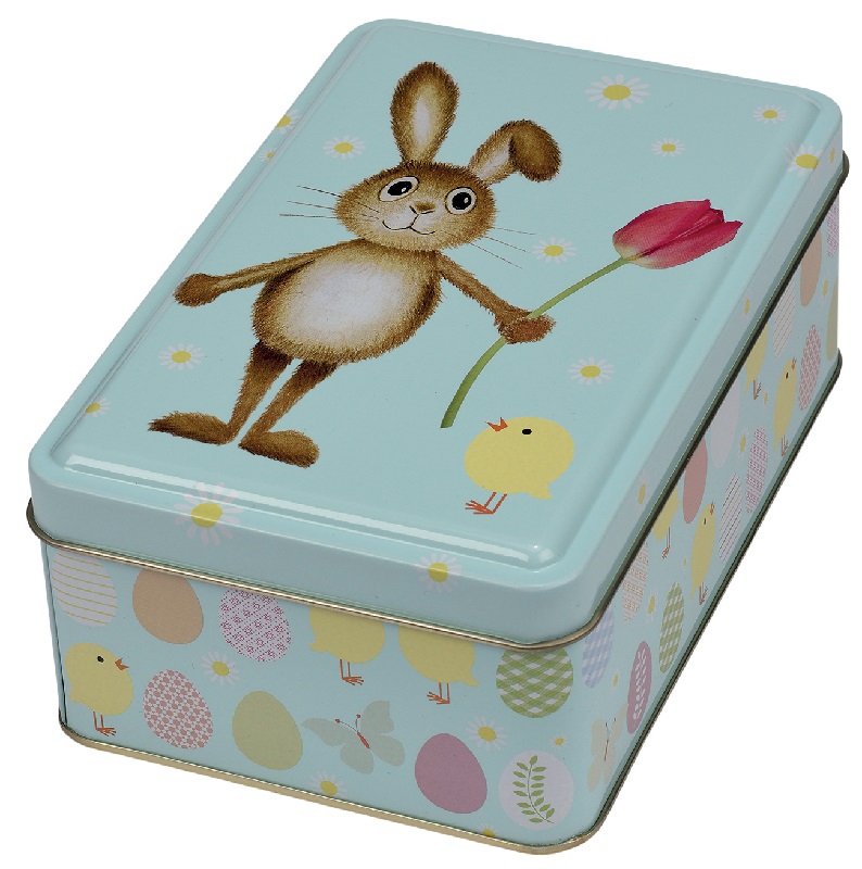 Rektangulær metalleske med påskemotiv med hengslet lokk.