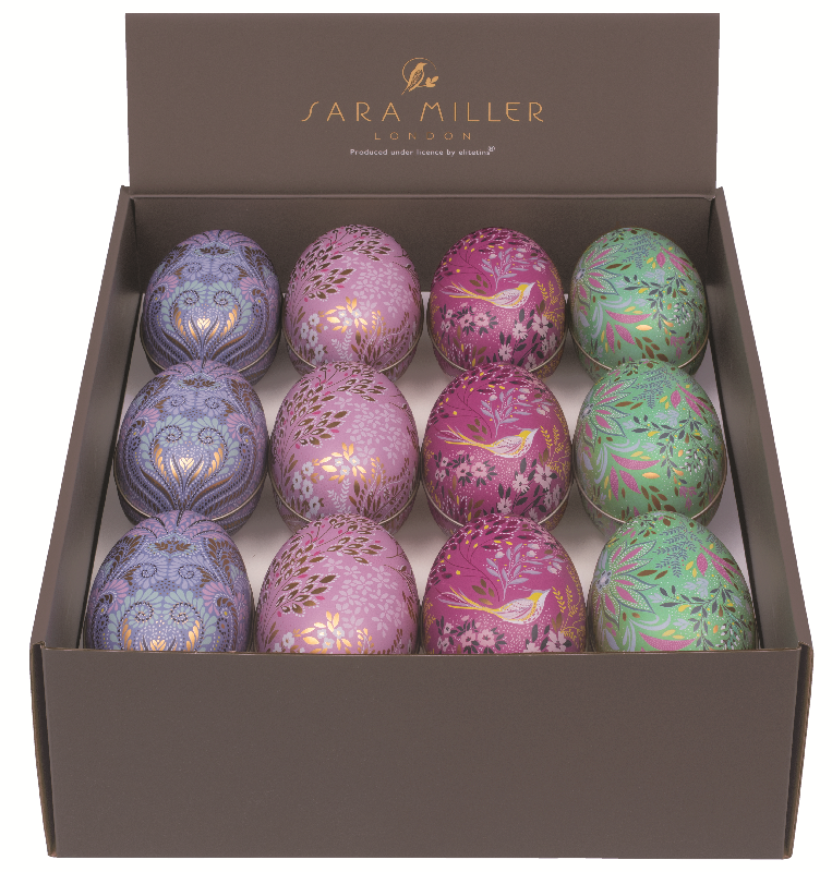 Påskeegg i metall (delbare) i display a 24 stk., 4 assorterte motiv fra Sara Miller, London.